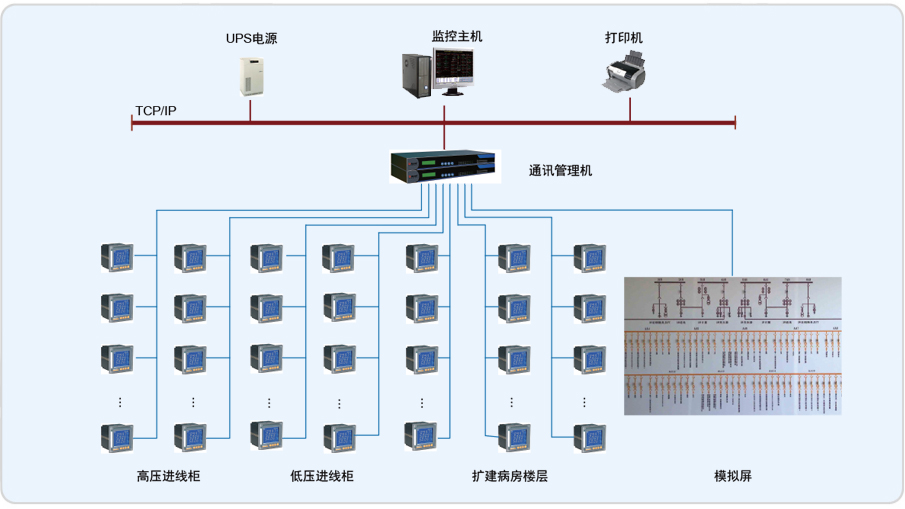甘上海華山醫(yī)院病房樓是一幢醫(yī)用建筑,建筑面積約為2萬平方米。根據(jù)配電系統(tǒng)管理和能耗監(jiān)測(cè)的要求,需要對(duì)樓內(nèi)的高壓進(jìn)線、低壓配出線和各樓層內(nèi)配電箱進(jìn)行電力監(jiān)控,以保證用電的安全、高效。