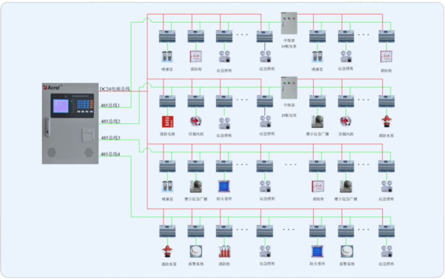 系統(tǒng)組網(wǎng)共分為站控管理層、網(wǎng)絡(luò)通訊層、現(xiàn)場設(shè)備層三層,該項(xiàng)目通訊總線共接入9條通訊總線,總線在樓層配電箱手拉手串接后,接入消防設(shè)備電源中繼器,在接入壁掛式后臺(tái),組成消防設(shè)備電源監(jiān)控系統(tǒng)的大動(dòng)脈。AFPM100消防設(shè)備電源監(jiān)控系統(tǒng)能夠?qū)ο涝O(shè)備的電源進(jìn)行實(shí)時(shí)的監(jiān)控,通過檢測消防設(shè)備電源的電壓、電流、開關(guān)狀態(tài)等相關(guān)信息,從而判斷消防設(shè)備電源是否有斷路、短路、過壓、欠壓、缺相、錯(cuò)相以及過流(過載)等故障信息并報(bào)警、記錄。通過友好的人機(jī)交互界面,實(shí)時(shí)反映出被監(jiān)控設(shè)備電源的狀況,并集中顯示,從而有效避免在火災(zāi)發(fā)生時(shí)消防設(shè)備由于電源故障而無法正常工作的危急情況,保障消防聯(lián)動(dòng)系統(tǒng)的可靠性。該項(xiàng)目現(xiàn)場共有152只AFPM3-2AV消防設(shè)備電源探測器模塊。