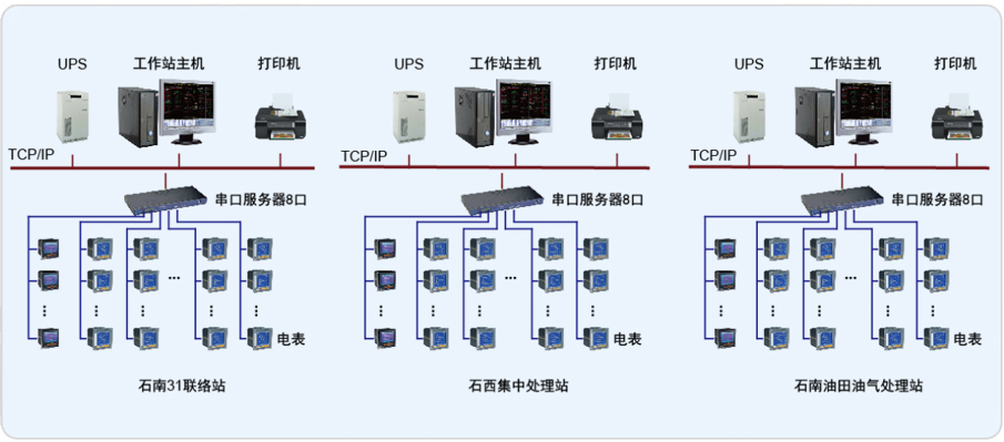 本系統(tǒng)針對以上需要解決的問題,對石南31聯(lián)絡站、石西集中處理站和石南油田油氣處理站三個站進行能耗管理系統(tǒng)改造,其中石南31聯(lián)絡站配置儀表78塊,石西集中處理站配置儀表35塊,石南油田油氣處理站配置儀表59塊,進線回路采用ACR320ELH多功能顯示儀表,出線回路采用PZ72-E4/KC,每個站為單獨一套系統(tǒng)。系統(tǒng)采用分層分布式結(jié)構(gòu),監(jiān)測數(shù)據(jù)采集完成后上傳傳至各自站內(nèi)監(jiān)控值班監(jiān)控室。