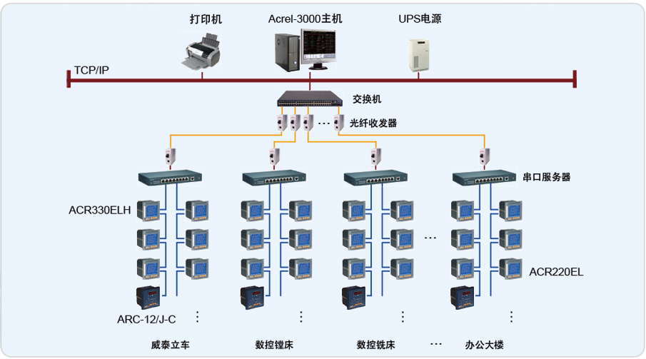 整個系統采用Acrel-3000型電能管理系統,完成了對威泰立車公司、數控鏜床公司、數控銑床公司、武漢善福公司、武重鑄鍛公司、大件加工廠、中小件加工廠、辦公大樓8個單位13個配電室各回路的電能監測和管理。其中低壓進線回路裝安科瑞ACR330ELH,低壓功率因數補償回路ARC-12/J-C型功率因數自動補償控制儀,其它回路配置ACR220EL網絡電力儀表。整個系統采用網絡分布式結構,監控主機位于10KV監控室內,系統采用開放的通訊協議,通過現場總線連接到通訊服務器 NPort5430 。13個配電室通過光纖組網與低壓配電系統相連,實現數據通訊功能。