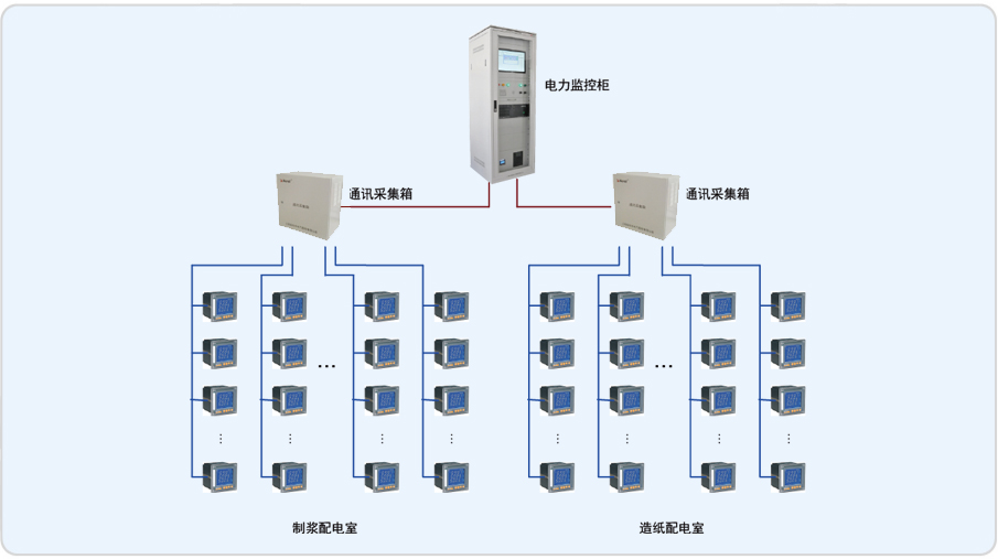 10kV回路的進(jìn)線和饋線配有微機(jī)保護(hù)裝置;0.4kV進(jìn)線和母聯(lián)回路裝有ACR330ELH電網(wǎng)質(zhì)量分析儀,采集回路的常規(guī)電參量、四象限電度和電網(wǎng)質(zhì)量參數(shù);0.4kV饋線回路裝有PZ80L系列多功能電力儀表,采集回路的常規(guī)電參量和四象限電度。本系統(tǒng)儀表集中,所以均通過(guò)屏蔽雙絞線手拉手相連數(shù)據(jù)上傳至監(jiān)控主機(jī)。