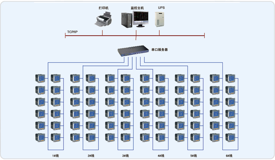 本項(xiàng)目為武漢愛機(jī)汽車配件有限公司變電所改造項(xiàng)目。根據(jù)配電系統(tǒng)管理的要求,需要對(duì)武漢愛機(jī)汽車配件有限公司3個(gè)變電所內(nèi)的8個(gè)低壓配出線進(jìn)行電力監(jiān)控,以保證用電回路的安全、可靠和高效的運(yùn)行。監(jiān)測(cè)范圍具體為T1、T2、T3、T4、T5、D1、D2和D3共8個(gè)變壓器的進(jìn)線柜側(cè)儀表進(jìn)行遠(yuǎn)程實(shí)時(shí)監(jiān)控和電能管理。該系統(tǒng)總計(jì)有8只儀表,分2條總線,都是直接通過屏蔽雙絞線走管道拉至值班室連接到串口服務(wù)器上,實(shí)現(xiàn)總線上儀表與監(jiān)控主機(jī)的數(shù)據(jù)連通。