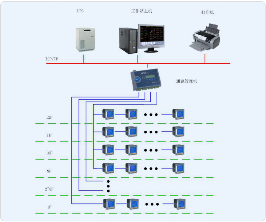 整個(gè)大樓采用兩路獨(dú)立的10KV高壓進(jìn)線,經(jīng)地下室10/0.4KV變配電所后供電,供電工作電壓為三相五線 380/220V。本工程地下室設(shè)置10/0.4KV變配電所,在樓層配電箱設(shè)分項(xiàng)計(jì)量,共48路計(jì)量節(jié)點(diǎn),包括照明、插座、空調(diào)等,具體建設(shè)目標(biāo)如下: