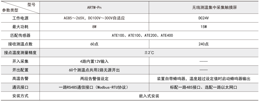 ARTM-Pn無線測(cè)溫裝置:ARTM-Pn無線測(cè)溫裝置可以單獨(dú)安裝在高壓柜、低壓抽屜柜內(nèi),每臺(tái)裝置可以接收18個(gè)傳感器的數(shù)據(jù),傳感器型號(hào)可選配ATE100、ATE200、ATE300。裝置帶有一路48...