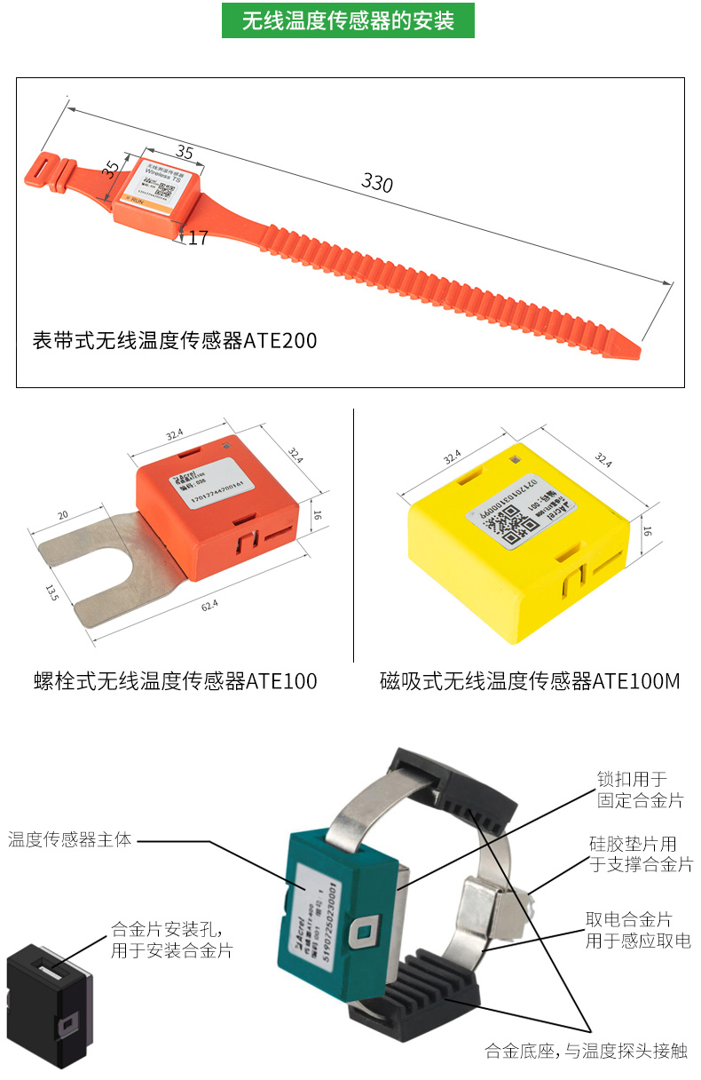 適用于高低壓開關(guān)柜內(nèi)電纜接頭、斷路器觸頭、刀閘開關(guān)、高壓電纜中間頭、干式變壓器、低壓大電流等設(shè)備的溫度監(jiān)測(cè)。