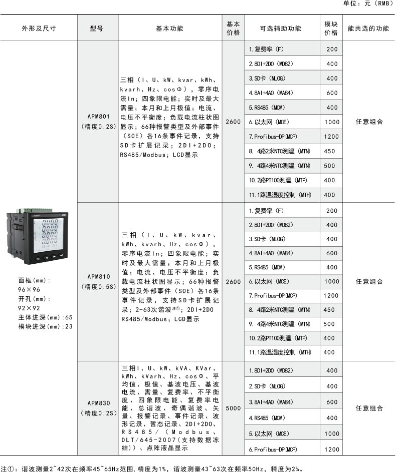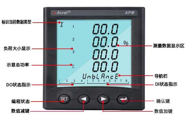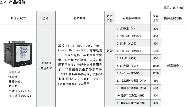 APM系列網絡電力儀表按IEC標準設計,具有全電量測量,電能統計,電能質量分析及網絡通訊等功能,主要用于對電網供電質量的綜合監控診斷及電能管理。該系列儀表采用了模塊化設計,當客戶需要增加開關量輸入輸出,模擬量輸入輸出,SD卡記錄,以太網通訊時,只需在背部插入對應模塊即可。