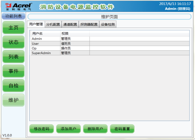 該界面可添加新的“操作員”和“值班員”權限的新用戶,也可刪除這兩個級別的現有用戶,該管理功能只有“超級管理員”和“管理員”可進行操作。