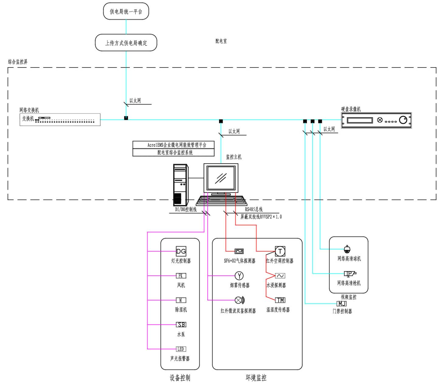 配電室綜合監(jiān)控系統(tǒng)包括智能監(jiān)控系統(tǒng)屏、通訊管理機(jī)、UPS電源、視頻監(jiān)控子系統(tǒng)(云臺(tái)球機(jī)、槍機(jī))、環(huán)境監(jiān)測(cè)子系統(tǒng)(溫度、濕度、水浸、煙感)、控制子系統(tǒng)(燈光、空調(diào)、除濕機(jī)、風(fēng)機(jī)、水泵)、門禁監(jiān)控子系統(tǒng)(讀卡器、開(kāi)門按鈕、磁力鎖)、安防監(jiān)控子系統(tǒng)(雙鑒檢測(cè)器)。